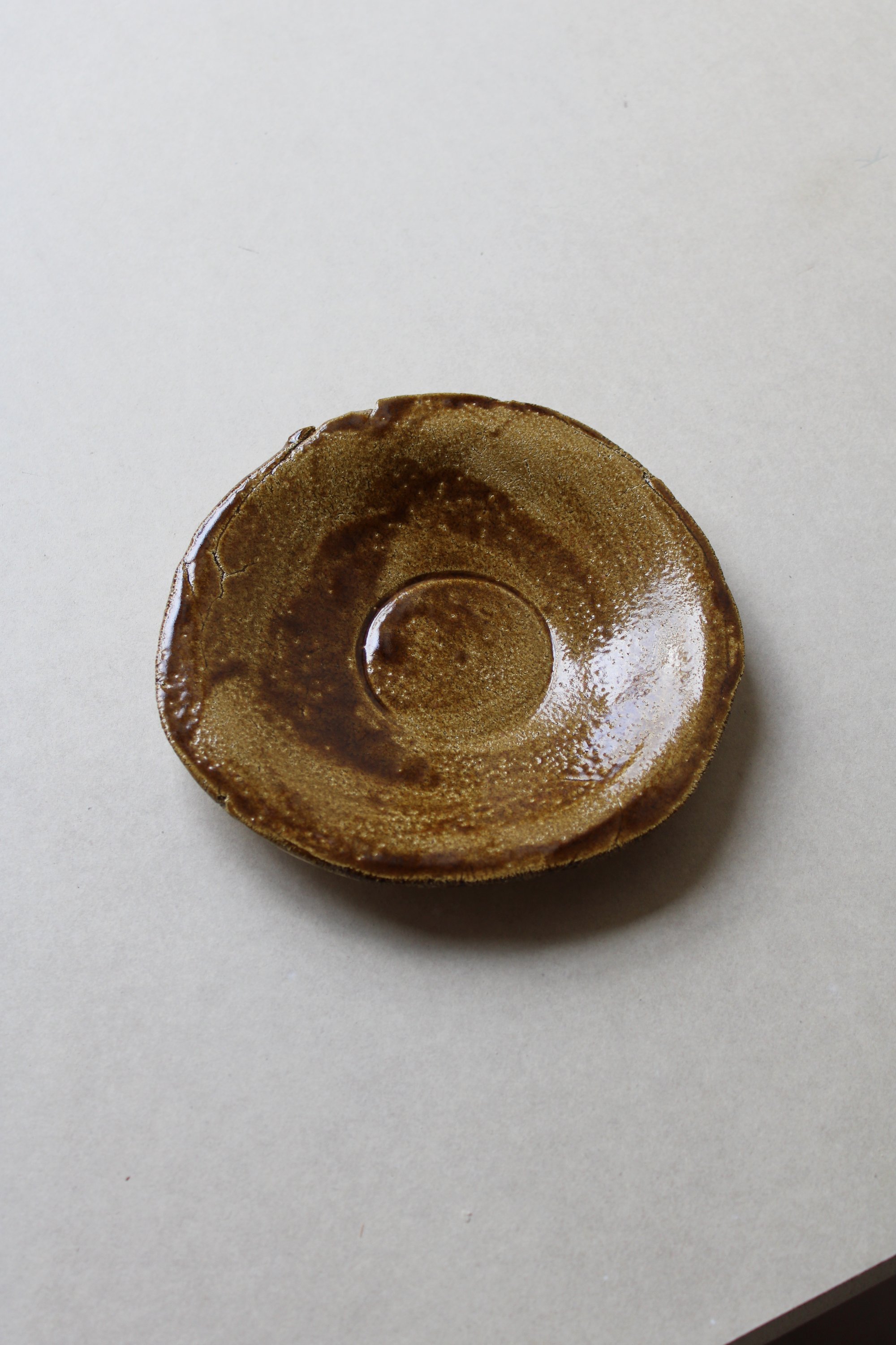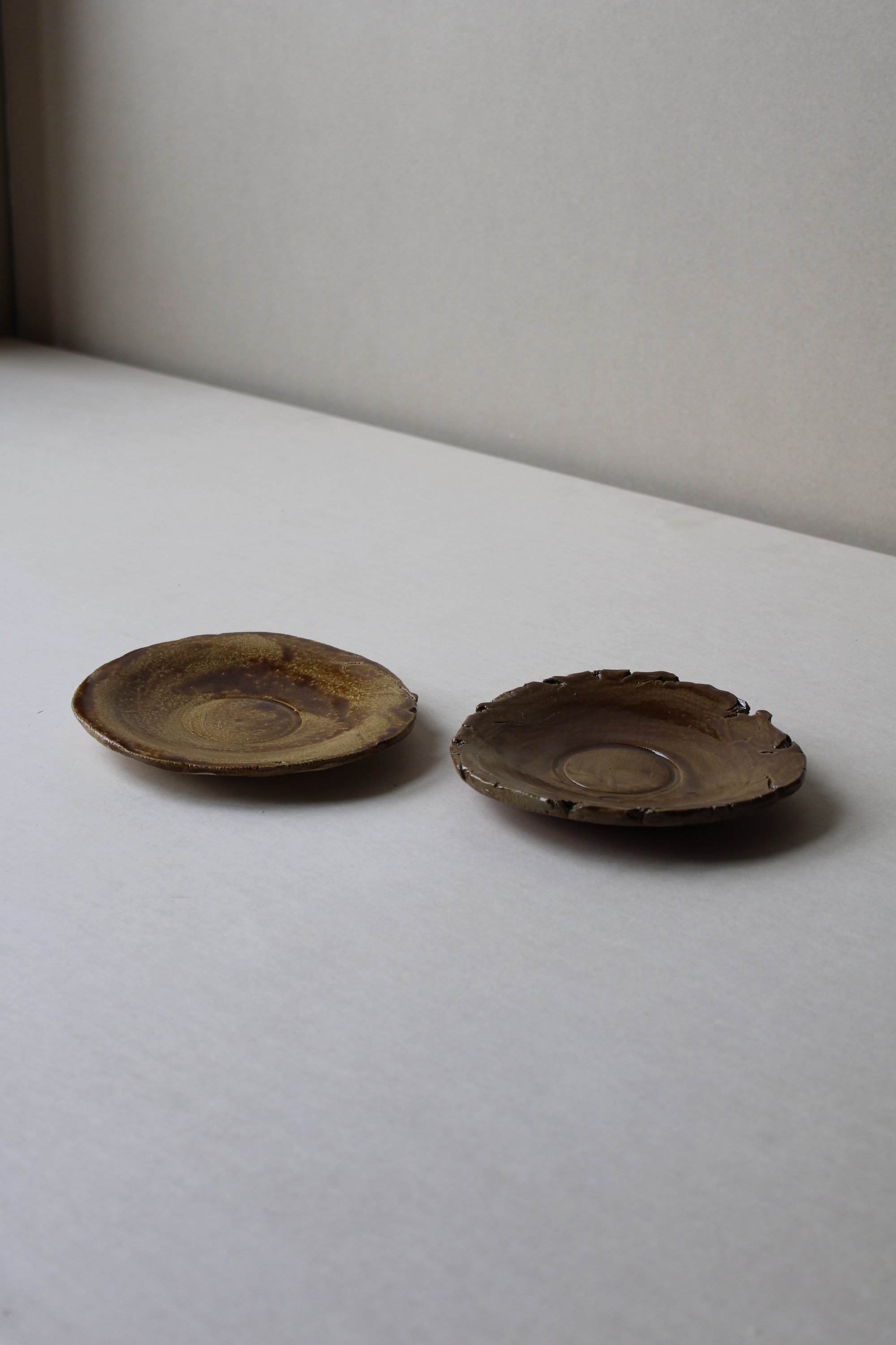 la serie emprinte, vient d'un geste spontané, la terre est mise à plat à la main, puis sèche sur une contre forme d'assiette. forme traditionelle et forme brute.