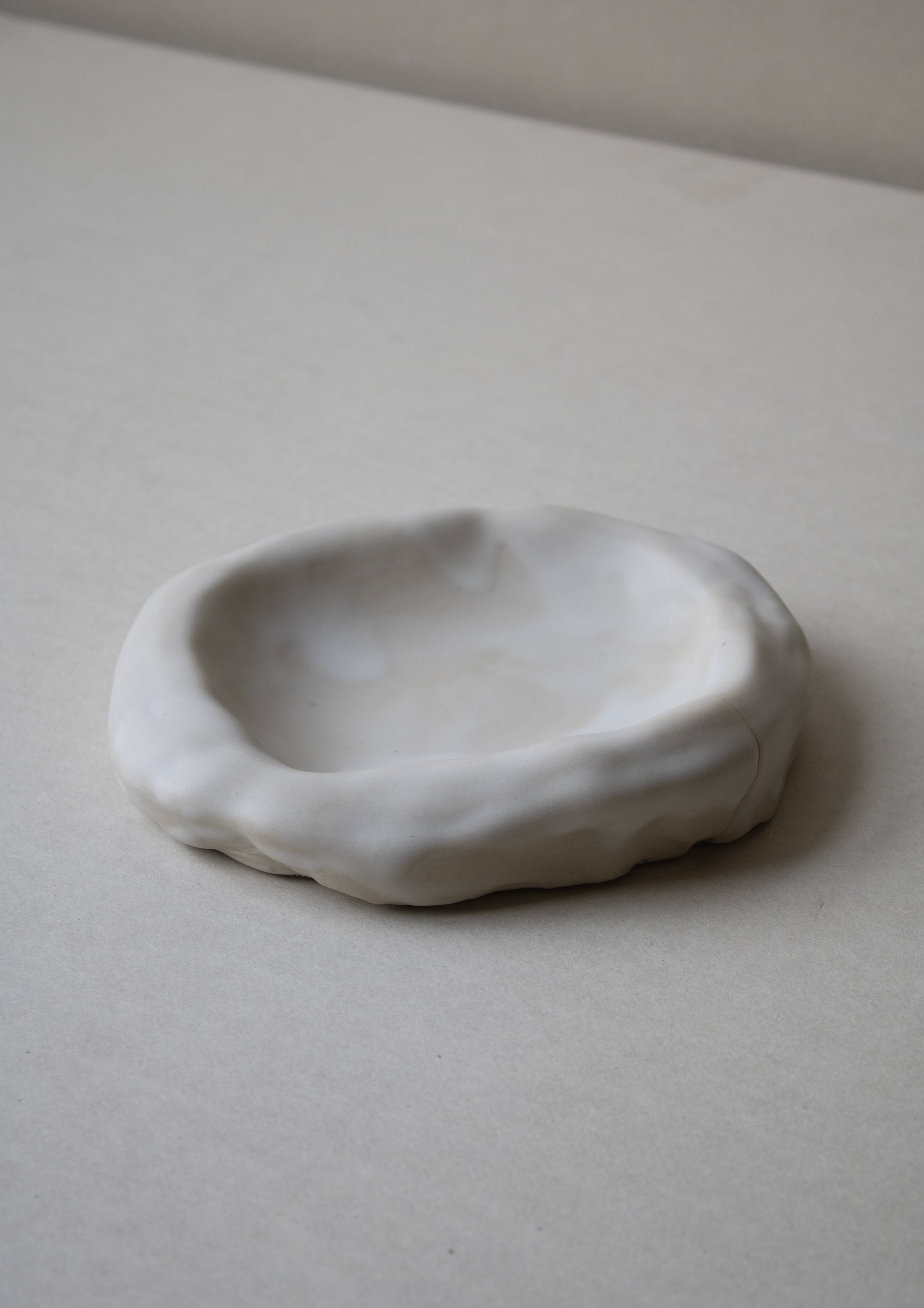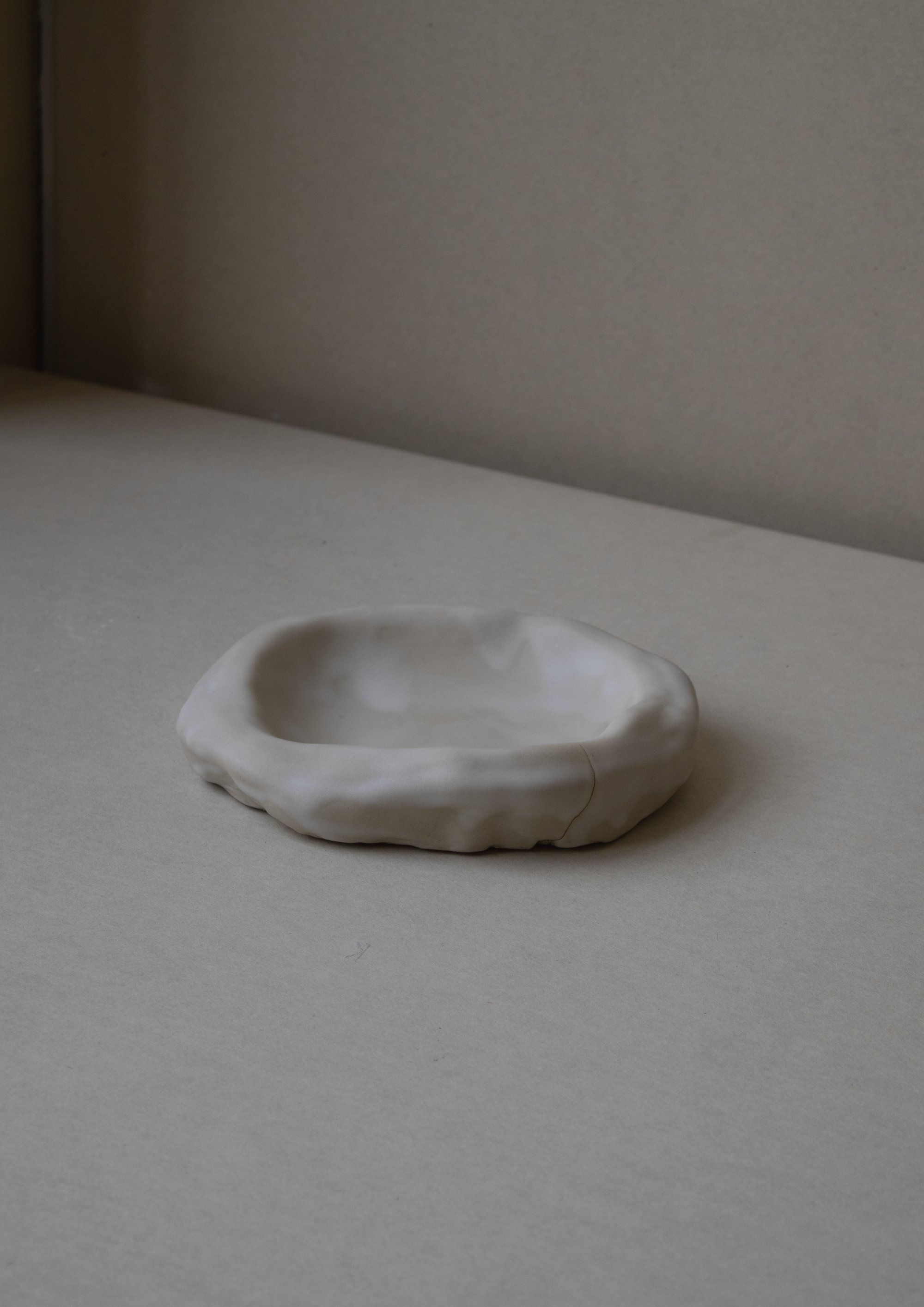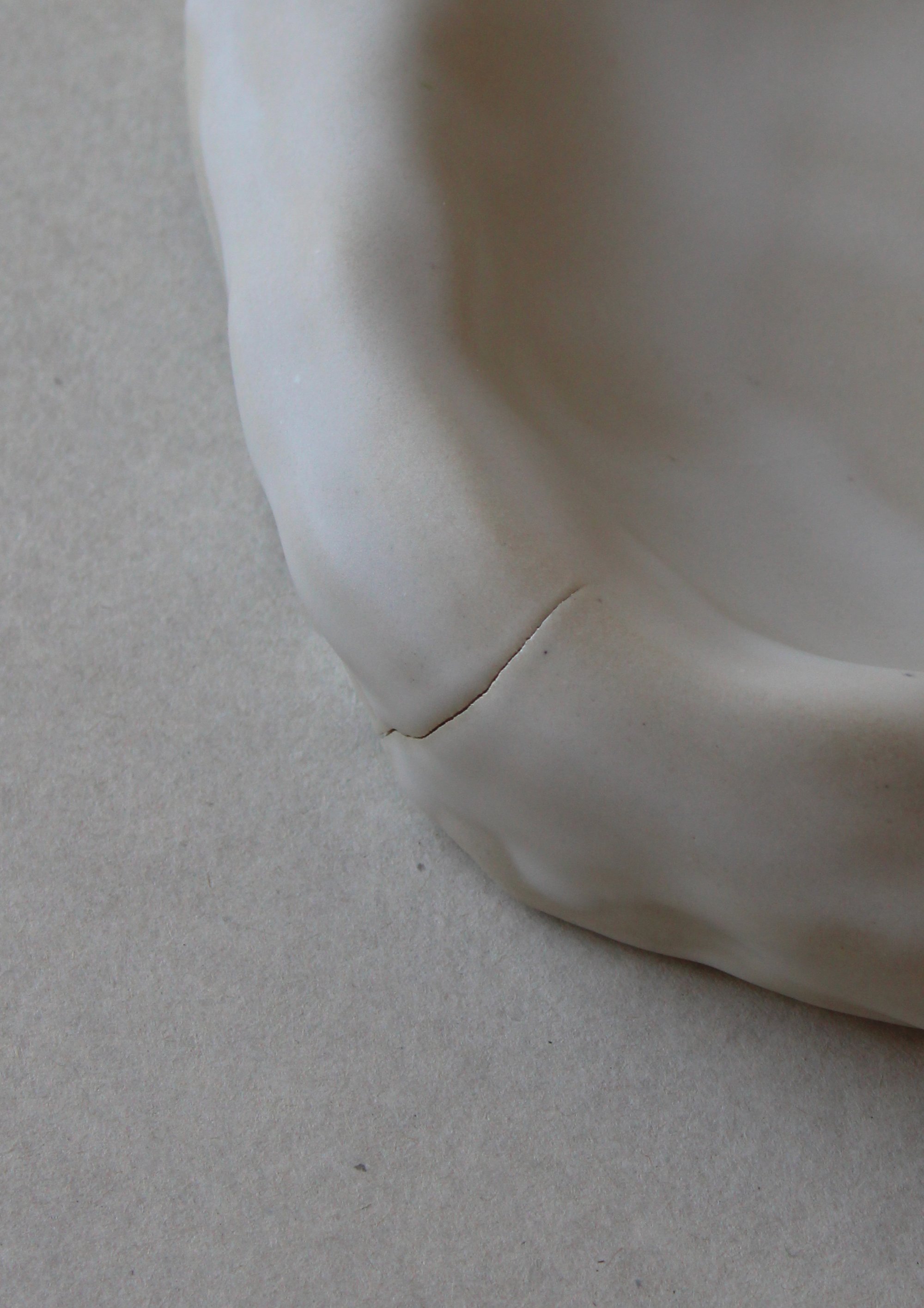 Cette assiette Nuage a développé une fissure sur l’un de ses côtés lors de la cuisson à haute température. Cette fissure est d’ordre esthétique et non structurel. À mon goût, elle ajoute de la sensibilité à la pièce et affirme sa singularité. C’est pourquoi je ne la considère pas comme un échec et me permets de la proposer à la vente.
