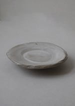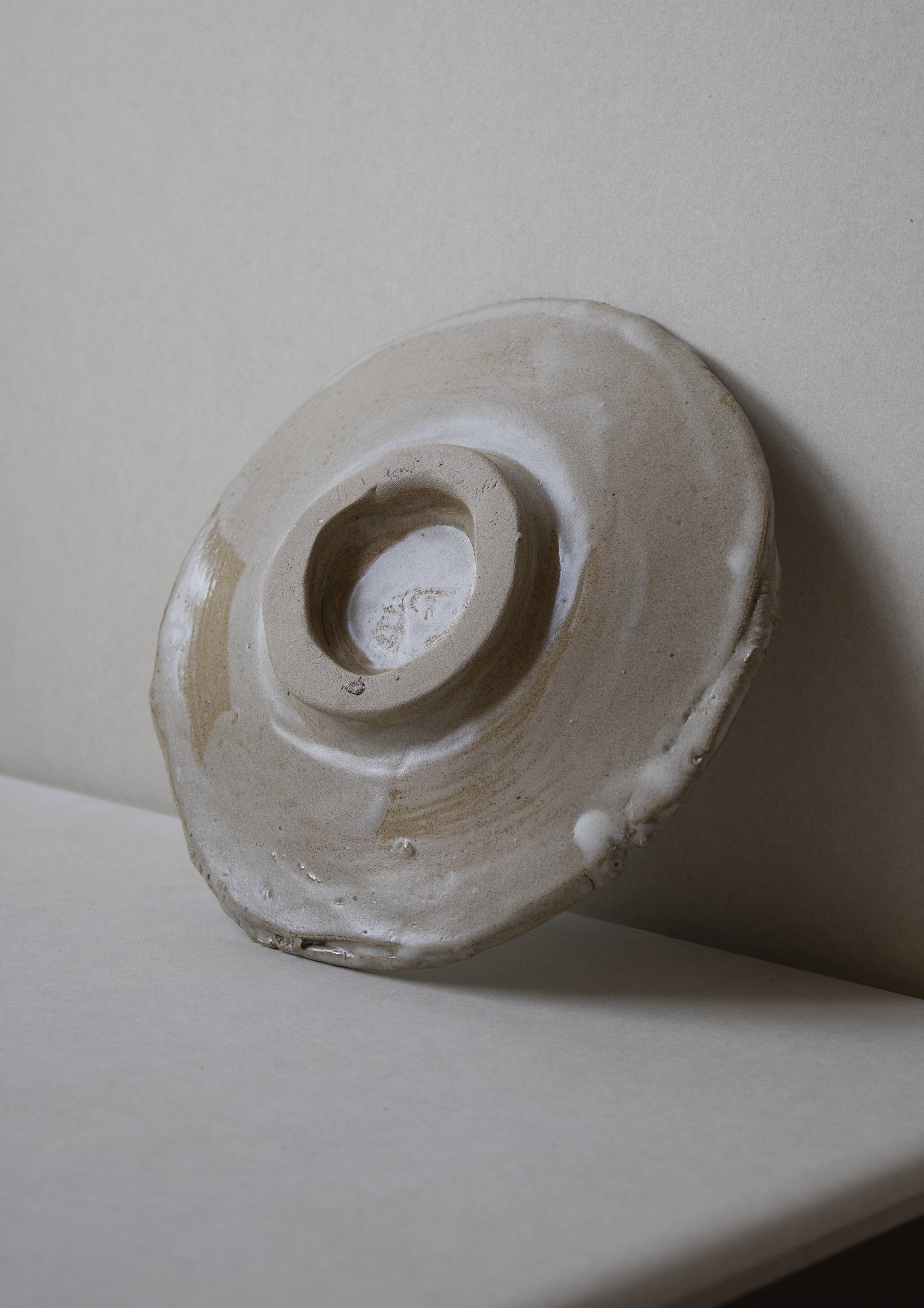 assiette sur pied 22 x 20,5x h4cm Terre caramel émail blanc à micro pois bleu cette assiette rentre dans une nouvelle série d'assiette visible sur mon site où l'ajout d'un pied vient faire flotter l'assiette et la décoller de la table. Elle est brute dans son façonnage mais reprend des formes traditionnelle d'assiettes en porcelaine. Cette collection c'est dessiné lors d'une résidence autour de l'apprentissage de la porcelaine coulée.