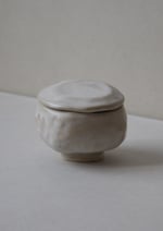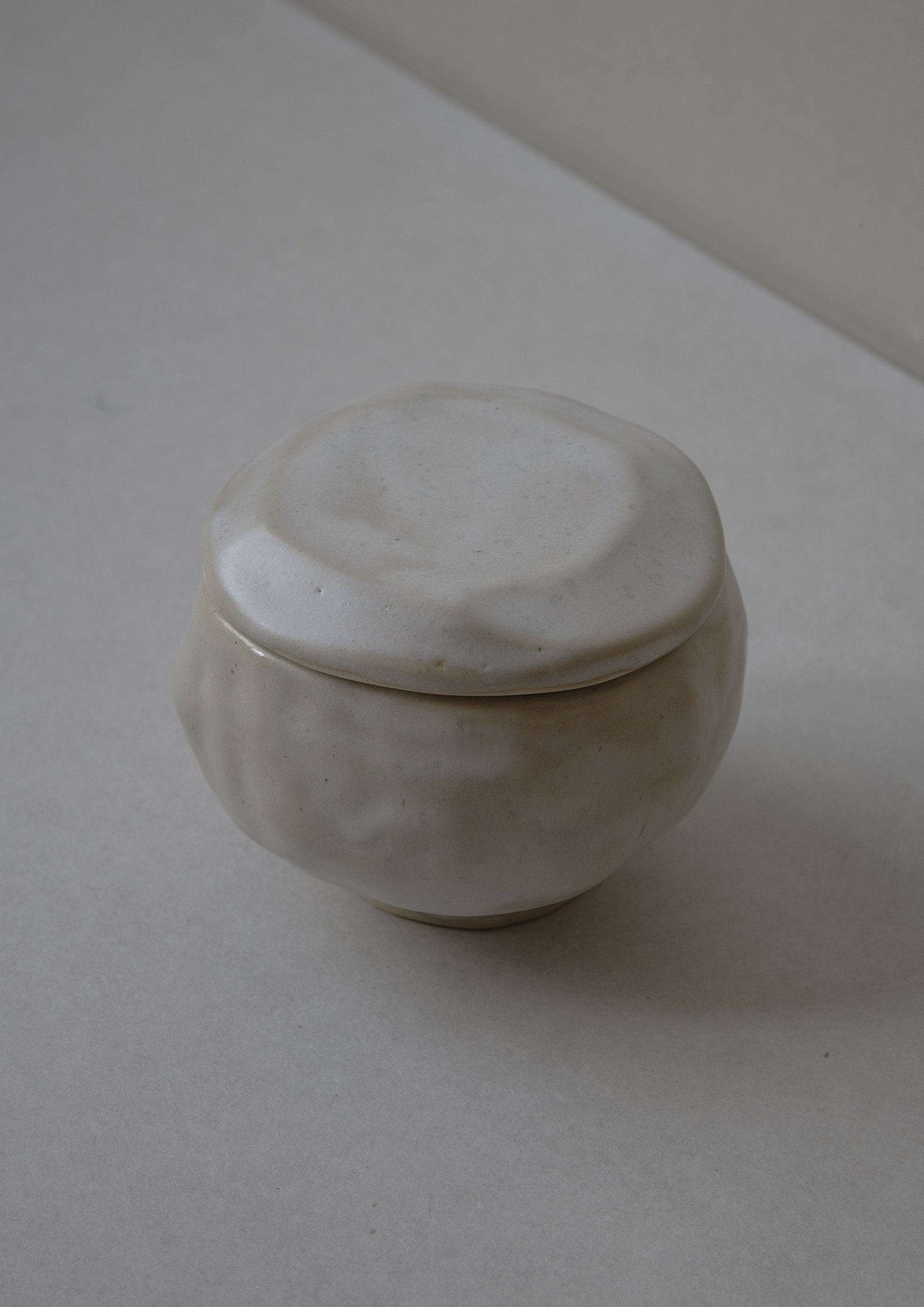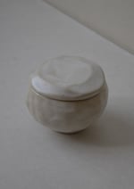 Ici, une boîte avec son couvercle. J’avais voulu changer mes gestes de façonnage, en remplaçant la technique de la plaque par celle des colombins, lui dessinant ainsi une forme plus ronde. J’aime son format, proche du bol. Je n’aime pas le couvercle. Une légère fissure est apparue à la cuisson.