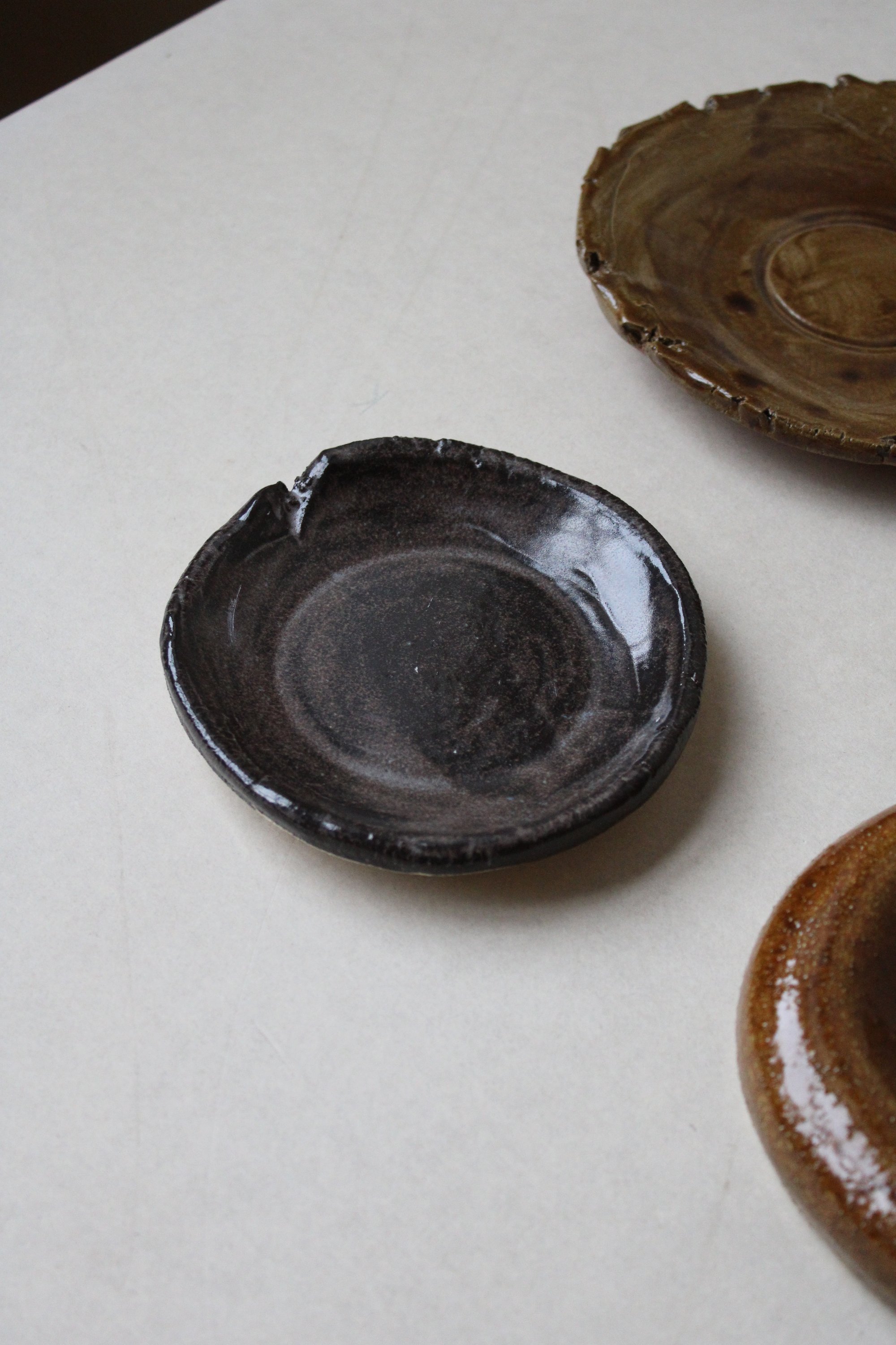 la série empreinte, vient d'un geste spontané, la terre est mise à plat à la main, puis sèche sur une contre forme d'assiette. forme traditionnelle et forme brute.