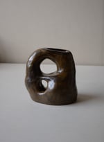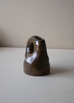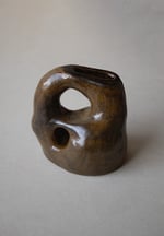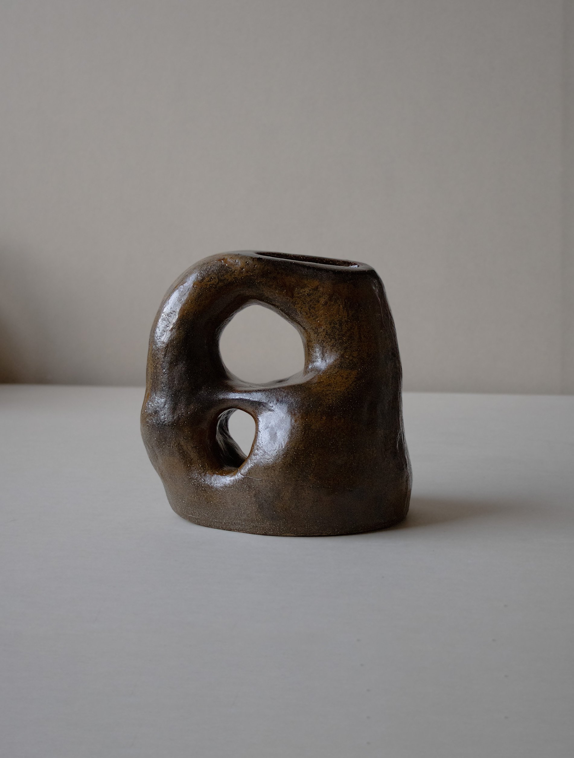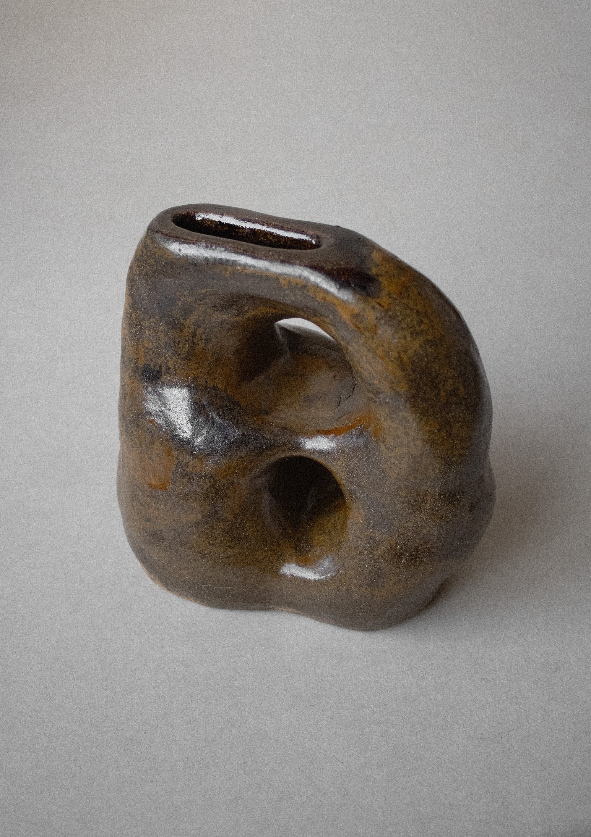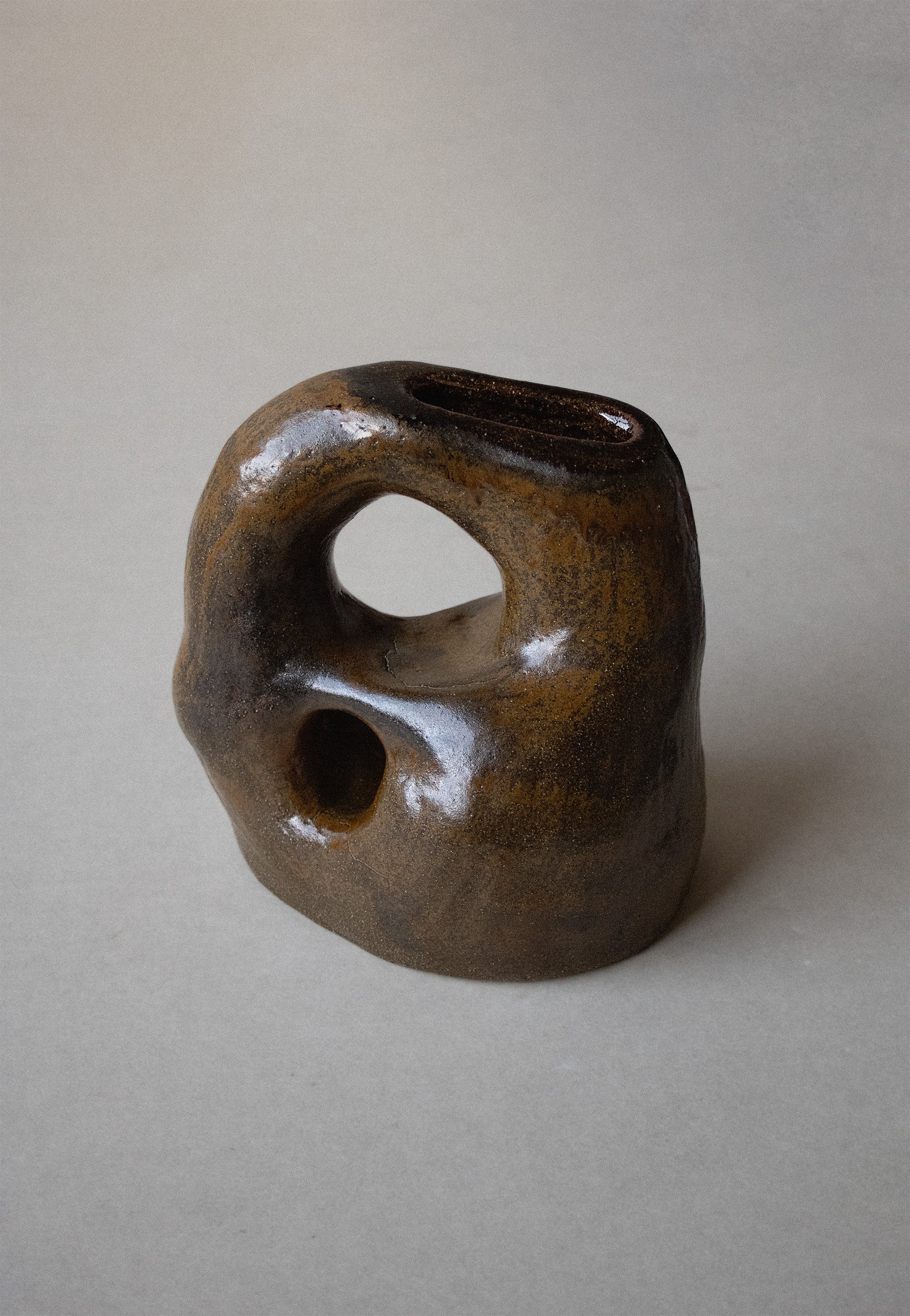 < Ce vase s’inscrit dans une nouvelle recherche formelle. Il est le premier vase que je réalise en terre ; il peut faire écho à mes carafes précédemment réalisées. Il rappelle aussi les nouvelles terres utilisées pour ma série de tasses. Il a été façonné dans un autre lieu que l’atelier — peut-être que mes mains et mes envies changent selon l’endroit.
