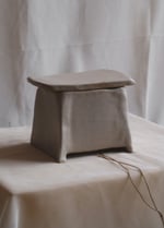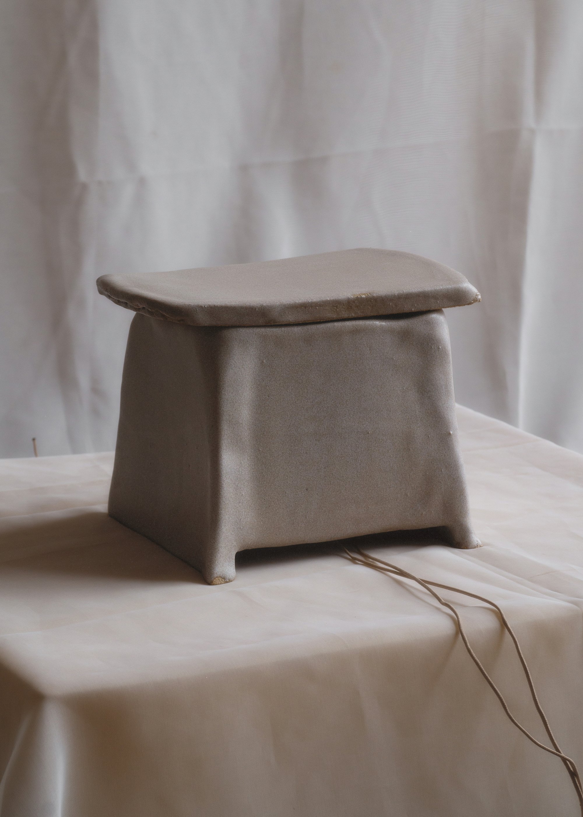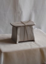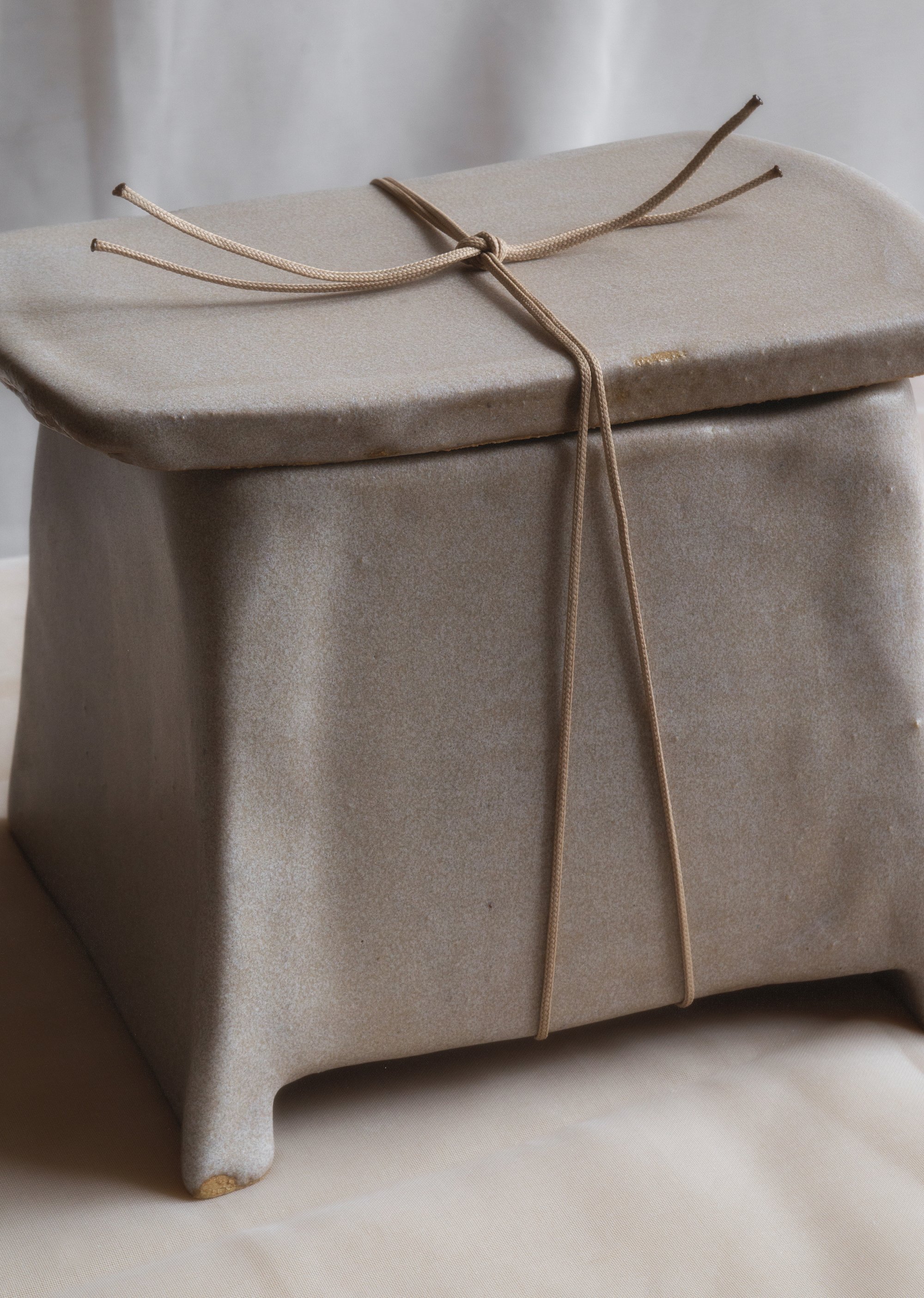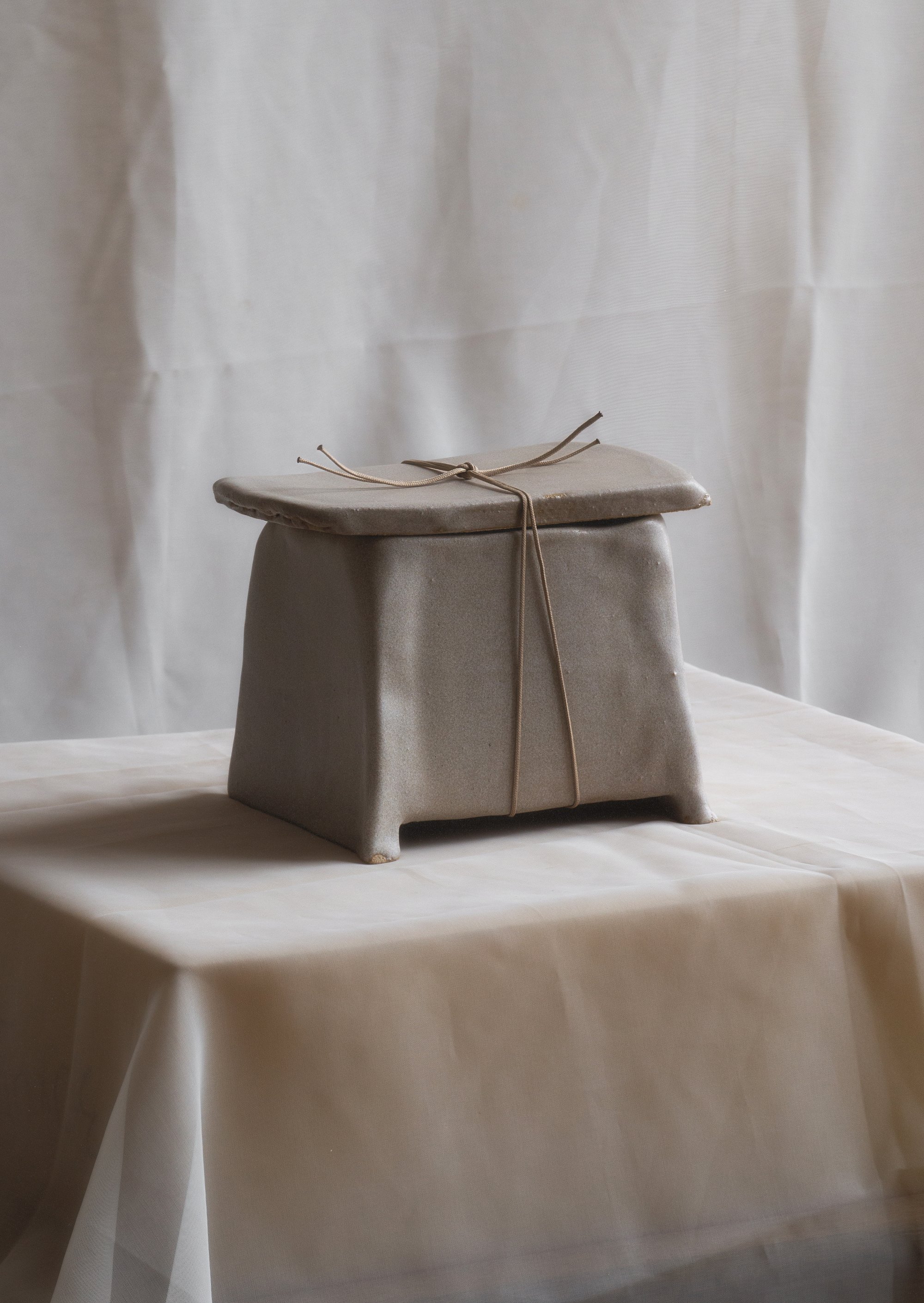 boite en céramique, grès blanc émail gris beige mat, cordon ciré.